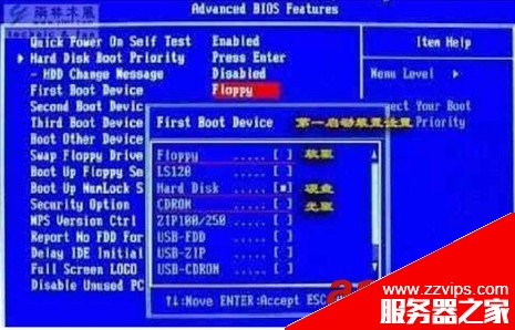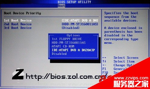 这个项目里,就可以设置系统优先从哪个设备引导。1st Boot Device自然是首引导设备,2nd Boot Device自然是第二个引导设备,以此类推。如果要使用光盘安装系统的时候,在这里就需要将1st Boot Device设置成光驱,如上图,选单里找到你所使用的光驱型号就可以;如果你想要从硬盘启动系统,那么你就需要在这里将硬盘设置成1st Boot