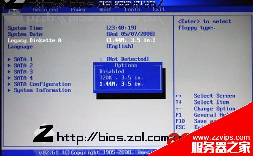 我们看到,菜单里的第三行Legacy diskette A,这个是配置软盘驱动器的一个选项。你可以在这里选择你软驱的类型,比如1.44M