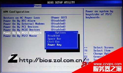 上图就是键盘开机的设置界面,这里有3种选择,分别是Space Bar(空格键),Ctrl-Esc,Power Key(键盘上的Power键)。当你选择相应的(组合)键之后,下次开计算机就可以直接通过相应的按键来开启了。