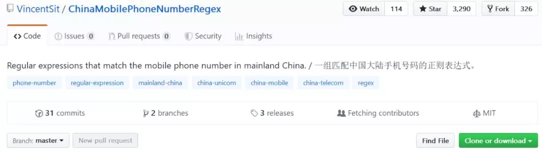 目前,该项目已经在GitHub上获得 3340 个Star,333个Fork(GitHub地址:https://github.com/VincentSit/ChinaMobilePhoneNumberRegex)
