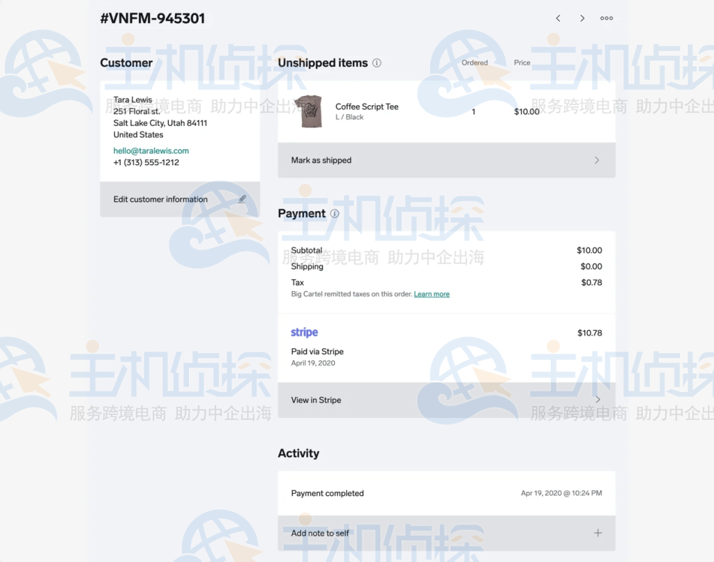在BigCartel建站后台页面可以找到迄今为止销售的所有产品的信息,包括客户的姓名、送货地址、订购的产品,甚至是否使用PavPal或Stripe结账,在每个订单的页面上,都包含了用于管理您的履行流程的工具。