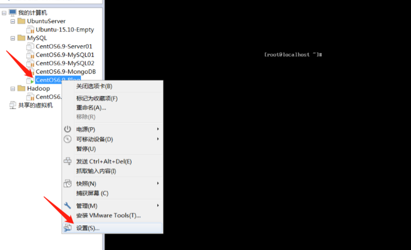 3、选中打开之后的虚拟机实例,右键->设置,如下所示: