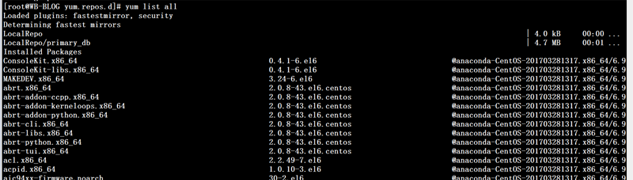10、然后执行"yum list all"查看本地yum源是否生效,如果可以输出常用软件包,表示本地yum源配置成功,如下: