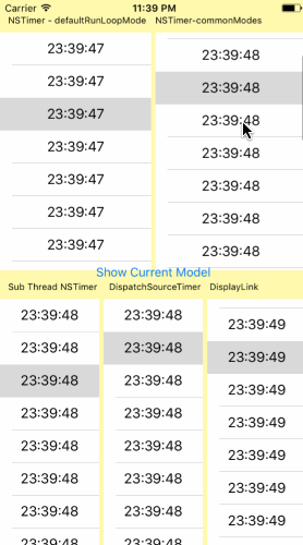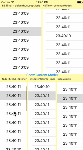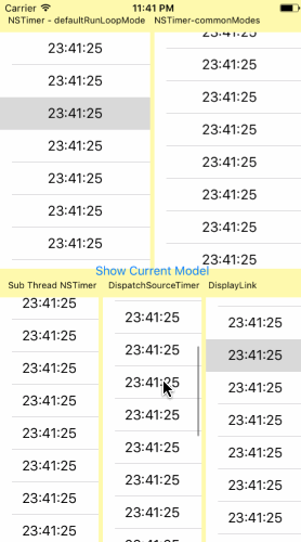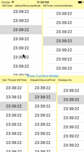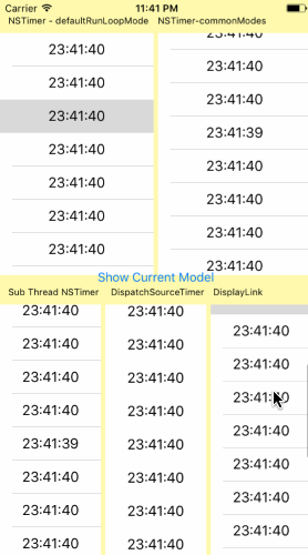 上述代码比较简单,就是在cell上添加了一个定时器,然后没1秒更新一次时间,并在cell的timelabel上显示,运行效果如下所示。从该运行效果中我们不难发现,当我们滑动tableview时,该定时器就停止了工作。具体原因就是当前线程的runloop在tableview滑动时将defaultmode切换到了trackingrunloopmode。因为timer默认是添加在runloop上的defaultmode上的,当mode切换后timer就停止了运行。