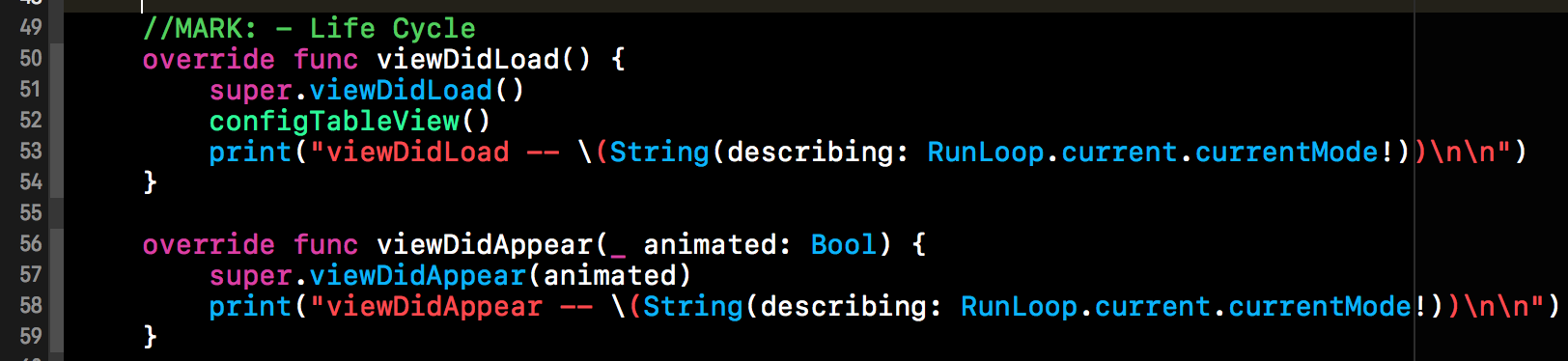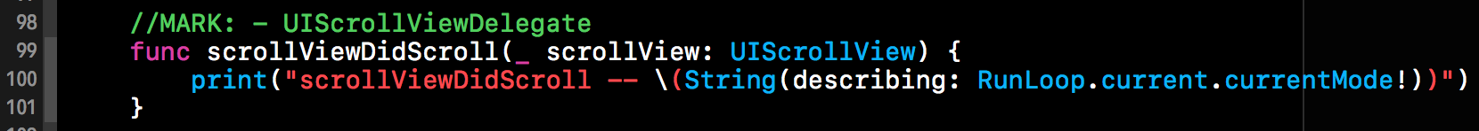 为了进一步看一下mode的切换,我们可以在相应的地方获取当前线程的runloop并且打印对应的mode。下方代码就是在tableview所对应的vc上添加的,我们在viewdidload()、viewdidappear()以及scrollviewdidscroll()这个代理方法中对当前线程所对应的runloop下的currentmode进行了打印,其代码如下。