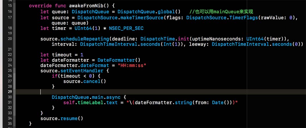 接下来我们就不使用nstimer来实现定时器了。在之前的博客中聊gcd时其中用到了dispatchtimersource来实现定时器。接下来我们就在tableview的cell上添加dispatchtimersource,然后看一下运行效果。当然下方代码片段我们是在全局队列中添加的dispatchtimersource,在主线程中进行更新。当然我们也可以在mainqueue中添加dispatchtimersource,这样也是可以正常工作的。当然我们不建议在mainqueue中做,因为在编程时尽量的把一些和主线程关联不太大的操作放到子线程中去做。代码如下所示: