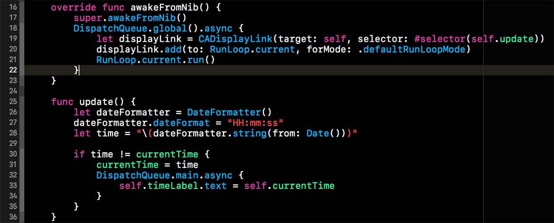 接下来我们来使用cadisplaylink来实现定时器功能,在之前的博客中我们也使用过cadisplaylink,不过是用来计算fps的。下方代码片段中我们就使用cadisplaylink来实现的定时器。cadisplaylink可以添加到runloop中,runloop的每一次循环都会触发cadisplaylink所关联的方法。在屏幕不卡顿的情况下,每次循环的时间时1/60秒。