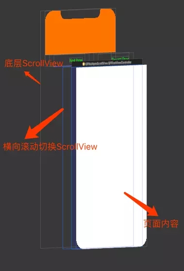 对应这种页面结构应该毫无疑问是最底层是一个纵向滚动的scrollview,它的页面上面放一个固定高度的header,紧接着下面一个支持横向滚动切换的容器scrollview,容器上面才是各个页面具体的tableview,如下图: