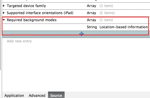 要真正能在锁屏状态下继续更新位置, 需要修改 info.plist ,增加后台位置权限。 找到项目中的 info.plist 文件, 双击打开, 并切换到 Source 标签, 如下图所示: