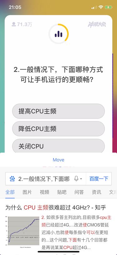 由于最近冲顶大会越来越热,网上就出现了各种辅助。大都是和“跳一跳”辅助一样的套路,截图使用python文字识别然后拿到题目和选项去搜索。我想做的是脱离电脑,直接在app里拿到题目进行搜索。以上截图就是最终实现的效果。话不多说让我们直接开始。