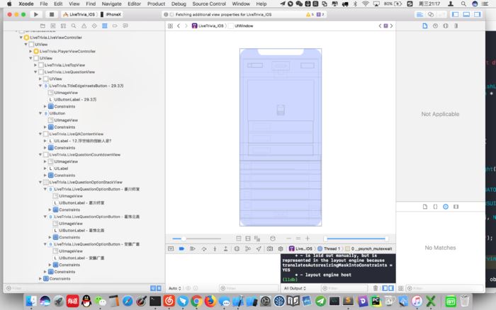 先添加到webview到window上,然后关联对象到liveviewcontroller上,留着后面用,加上button是用来控制webview的frame,下面的qalabel是存放问题的,三个optionbutton分别是三个选项。同样我们关联到controller上,我们还要监听questionview的alpha值的变化。