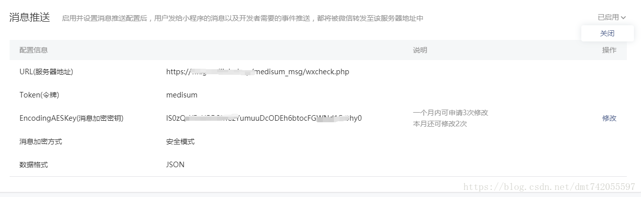 encodingAesKey、token、appId这几个值最好填写为你小程序及配置中对应的值,其实我也没测试有没有影响,但还是这样做了。