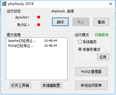 PHPStudy不一样,它含有IIS+PHP和Apache+PHP,软件推荐设置是后者。在任务托盘里也有图标,可以打开面板来看服务运行状态,也很简洁。打开localhost,出现的是标准的PHP信息界面。