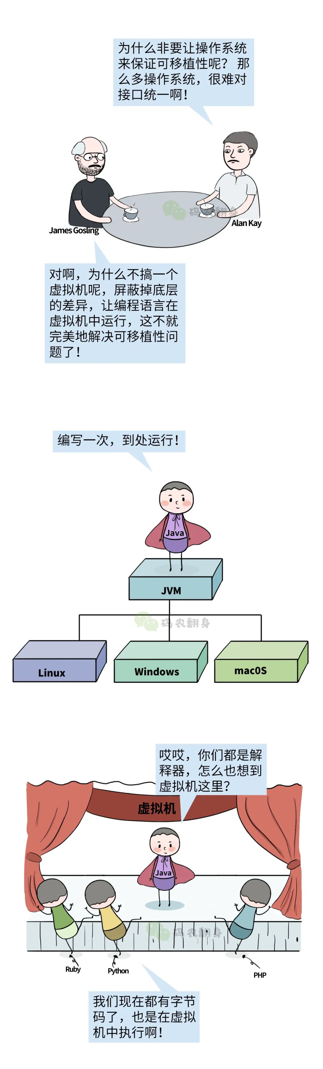 除了统一操作系统统的API,还有些大神决定对编程语言开刀,在操作系统之上再增加一个抽象层:虚拟机。
