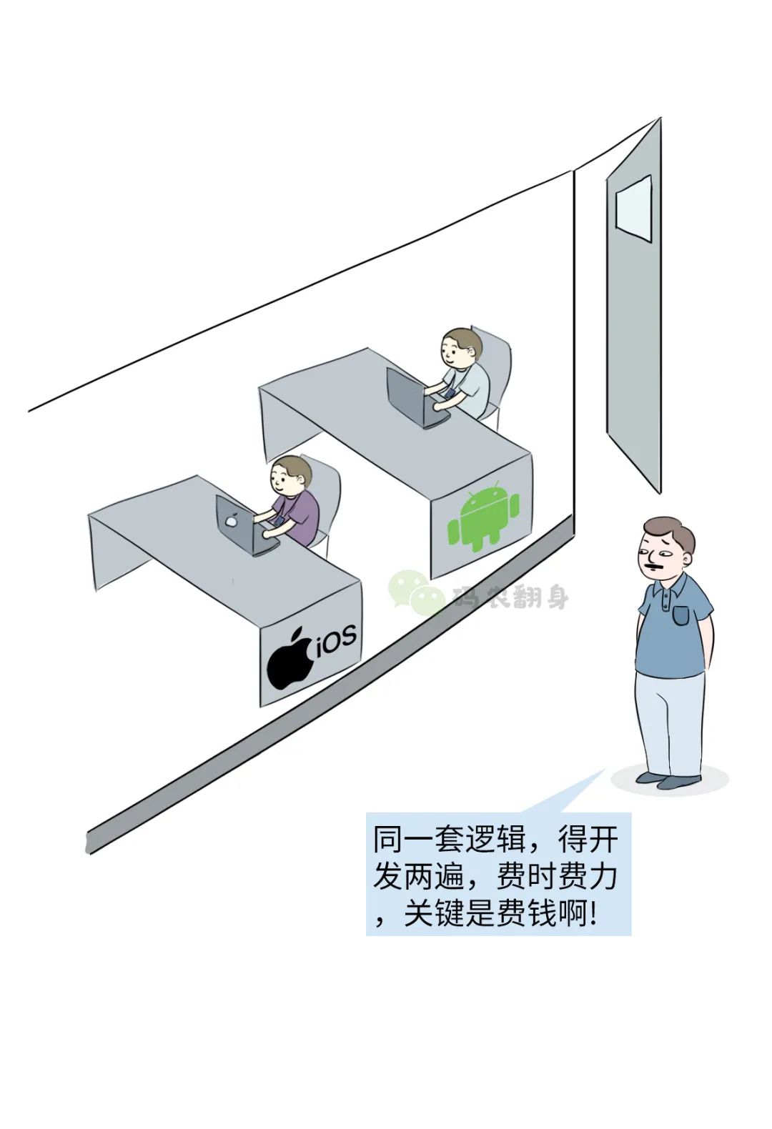 一个公司要开发原生App,必定要维持两套班子:iOS程序员和Android程序员。
