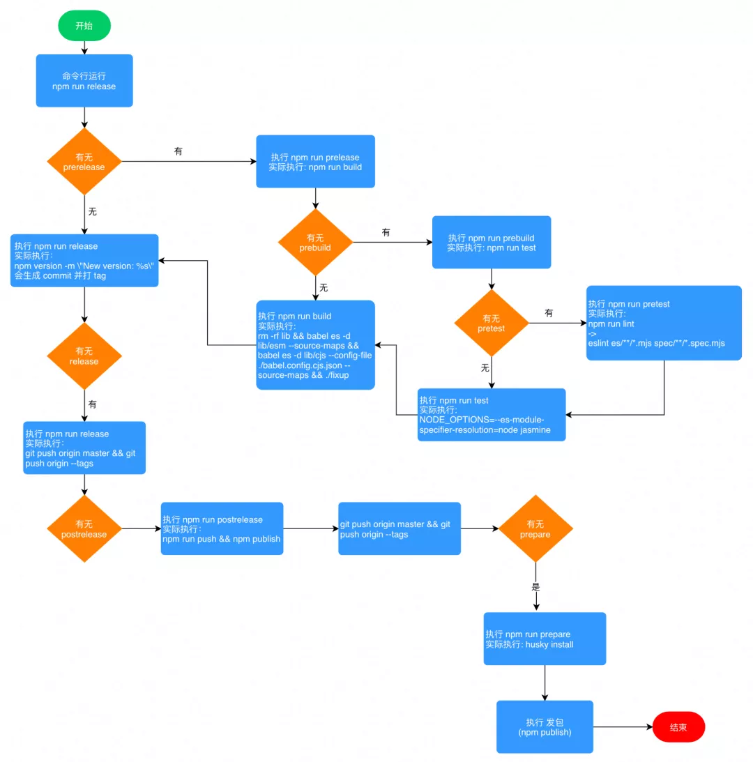 可以得知,当前项目直接使用 Babel 作为打包编译工具,通过执行 npm run release 发包,并结合 npm scripts 的 pre 和 post 执行生命周期依次执行完成如下任务: