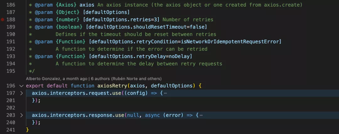 axios-retry 主要接受两个参数,第一个是 axios 实例,第二个是 axios-retry 的配置 defaultOptions: