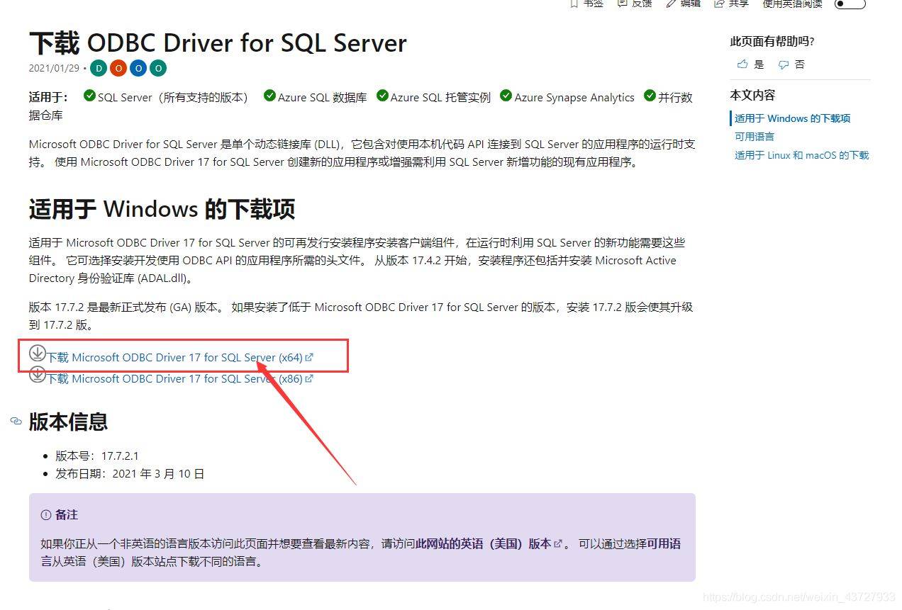 下载地址:http://docs.microsoft.com/zh-cn/sql/connect/odbc/download-odbc-driver-for-sql-server?view=sql-server-ver15