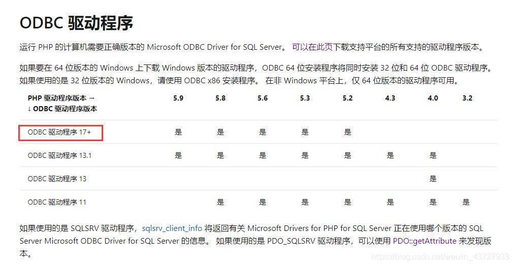 3.1从下图可以看到ODBC驱动程序11和13已经不在支持PHP5.9以上的版本,如果你下载的PHP模块是5.9以上的建议下载ODBC17以上的版本