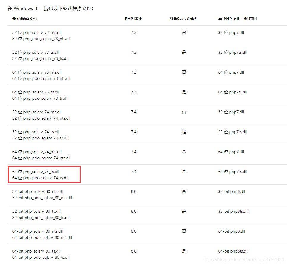 下载网址:http://docs.microsoft.com/zh-cn/sql/connect/php/download-drivers-php-sql-server?view=sql-server-ver15