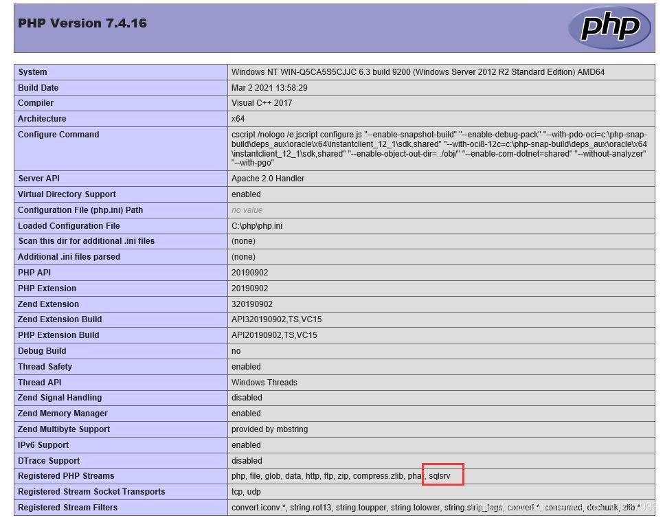 如果phpinfo.php 文件中Registered PHP Streams选项中没有sqlsrv 选项,但有pdo_sqlsrv选项说明