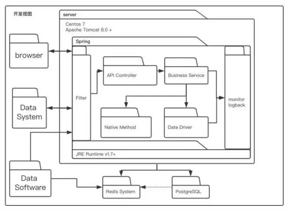 开发视图用于描述系统的模块划分和组成,以及细化到内部包的组成设计,服务于开发人员,反映系统开发实施过程。