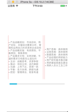 nsarray *textdesarr=@[@ "• 产品战略规划:市场目标、用户目标、关键成功要素分析、管理和运用自己的资源来达成目标\\n• 产品战略实施:有损原则、平衡原则、聚焦原则\\n• 产品需求文档:实例讲解,牛逼的需求文档是怎么诞生的\\n• 主动:战略思考、资源争取\\n• 推动:项目立项、迭代跟踪\\n• 沟通:上传下达、思想一统\\n• 平衡:各方协调、跨部沟通\\n• 把控:管理得法、取舍有道" ,