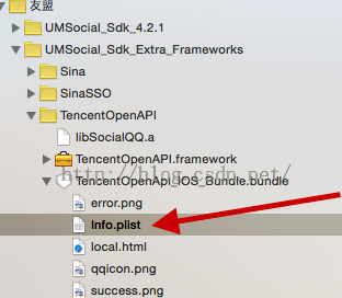 首先这个原因导入了其他第三方导致的问题,首先找到友盟库里面的腾讯api,找到其中的info.plist文件: