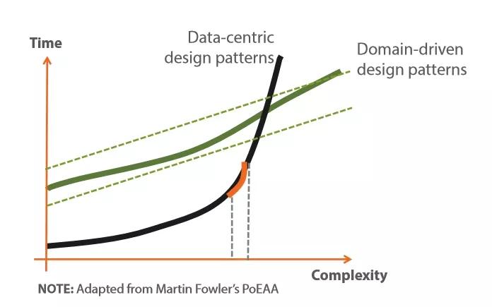 这是Martin Flowler在 Patterns of Enterprise Application Architecture 这本书中所提的关于复杂度的观点,他将软件开发分为数据驱动与领域驱动。很多时候开发的方式大家倾向于,拿到需求后看表怎么设计,然后看代码怎么写,这其实也是面向过程的一个表现。在软件初期,这样的方式复杂度是很低的,没有复用没有扩展,一人吃饱全家不饿。但随着业务的发展系统的演进,复杂度会陡增。