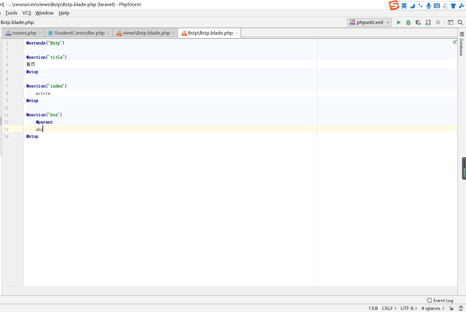 然后,打开我们view目录下的Bstp目录里的Bstp.blade.php文件,然后输入@extends,并且给他赋予一个控制器和路由