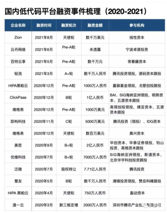 2021年初,和许多新技术一样,低代码(Low-code)开发被推上了“风口”:阿里云认为低代码开发将是一场“革命”;腾讯云将低代码视为一种有益的技术手段,并与Mendix(被西门子收购)展开了深度合作;高瓴、IDG、华创资本等投资机构将低代码视为投资新赛道,据统计,2020年1月-2021年8月,仅中国国内就有至少15个低代码平台获得超20家主流机构的投资。