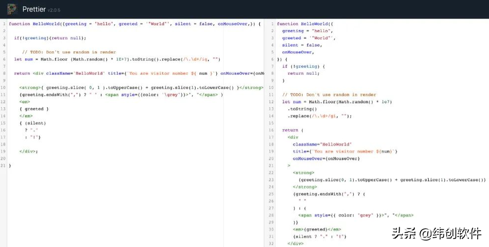 [Prettier]是一款代码格式化工具,左右两栏的操作界面,左边是原始代码,右边是格式化后的代码。支持多种格式的代码,[JSX]、[Angular]、[Vue]等等。它会移除代码原本的样式,替换成标准化的代码样式,IDE 大多支持 Prettier 工具。值得一提的是, Prettier 也有在线版本,在浏览器中也可格式化代码。