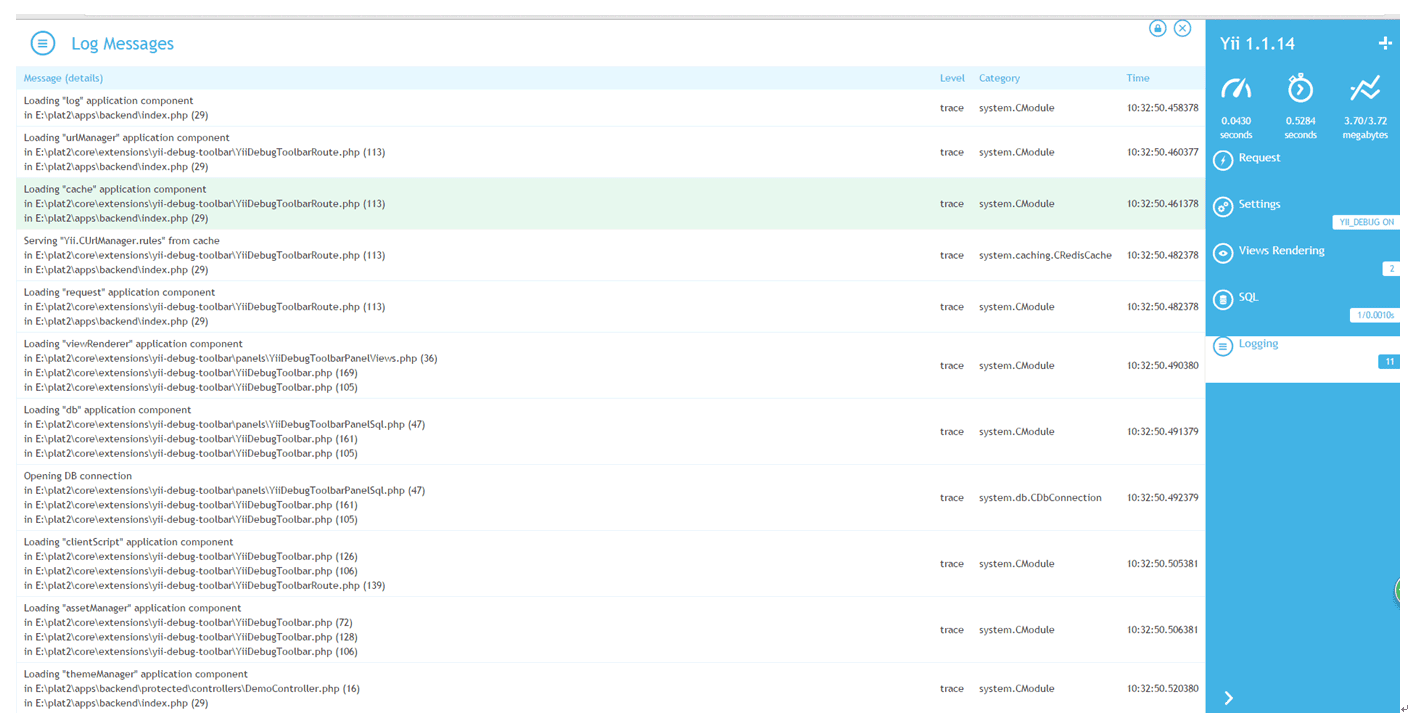 - Yii::log("test my cate" , CLogger::LEVEL_INFO , "debug");