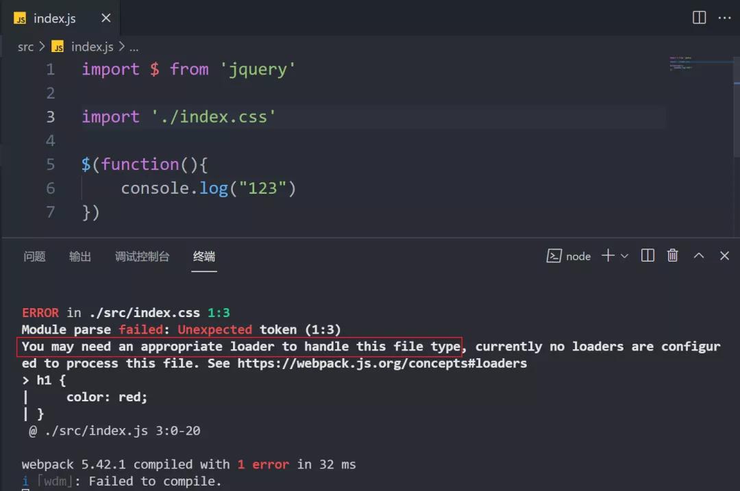 我们在开头的时候已经说过一句话,在前端工程化中,万物皆模块。因此我们可以在 index.js 脚本文件中通过 import 的方式导入 jquery js文件。那遇到 css 文件是否一样能够通过 import 导入?我们不妨一试:
