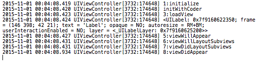 上面这么多的函数,乍一看什么复杂,其实关系什么明朗,除了initialize,init和initwithcoder不是存在所有对象的声明周期中,其他函数都会在uiviewcontroller的声明周期中有序的被调用。那么具体的调用顺序是怎样的呢,最好的办法是实践一下,通过编号打印,结果如下: