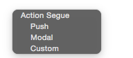 在storyboard中进行界面跳转是十分方便的,我们在storyboard中拉入两个viewcontroller,在一个上面添加一个按钮,点住按钮按住control,将鼠标拉到第二个controller上,会出现如下的跳转选项: