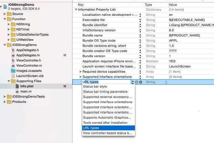 每一个项目里面都会有一个info.plist配置文件。找到info.plist,右键选择add row,然后选择url types。如图所示:
