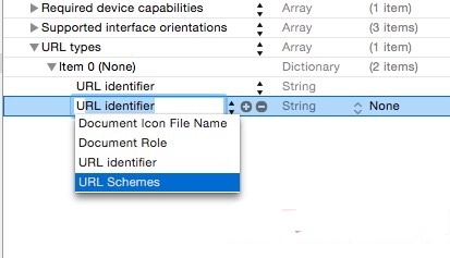 添加完url types,点击展开。右键选择add row,添加url schemes: