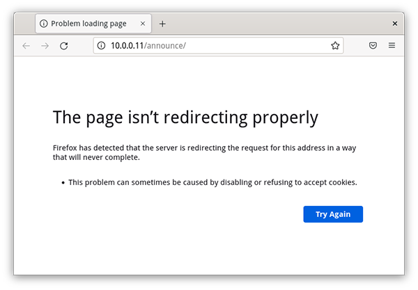 我在这个输出中省略了很多重复的内容。通过阅读服务器的响应,你可以看到http://10.0.0.11/announce/立即重定向到http://10.0.0.11/assets/,然后又重定向到http://10.0.0.11/announce/。以此类推。这是一个无休止的循环,wget将在 20 次重定向后退出。但有了这些调试信息,你可以修复重定向,避免循环。