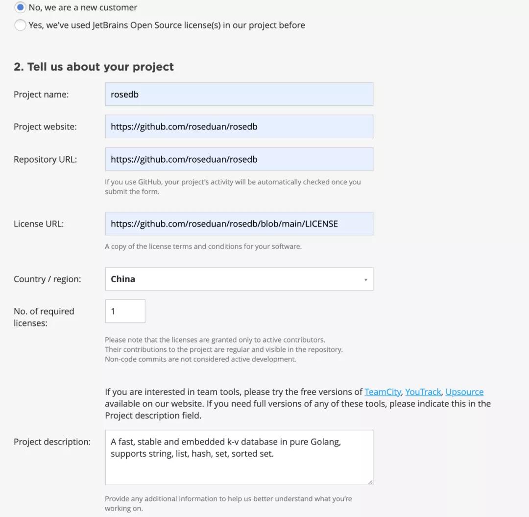 的确是可以申请的,然后就填了我的申请信息,就是开源项目的一些基本信息,这里我用的是 rosedb 这个项目:
