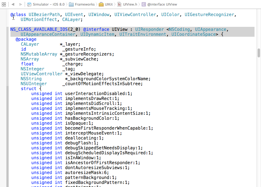 既然uiview是所有控件的父类,那么对于一些常用的方法我们很有必要弄清楚,其实在xcode中要了解一个类有哪些属性和方法特别简单,只要按住apple键点击类名就可以定位到这个类中查看相关定义(在日后的开发中我们会经常这么来做,毕竟要记住ios开发中所有的api是不现实的,有些api我们可以通过这种方法来查找),例如我们可以查看这个类的内容: