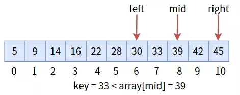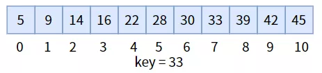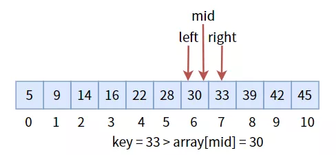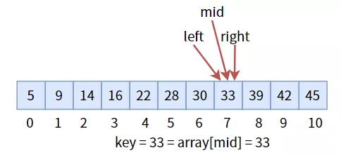 中间值 33 等于目标值key,返回其下标,即 mid。