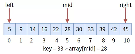中间值 28 小于目标值key,说明目标值在右半区,所以更新三个标志位,进入右半区,然后继续比较:
