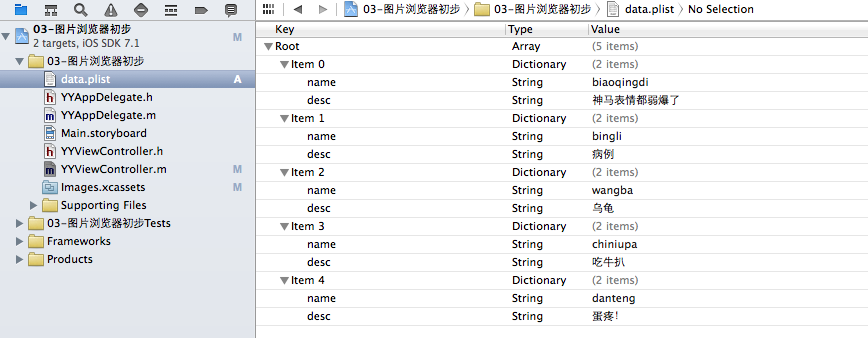 2.使用plist:让数据的操作更加灵活,把数据弄到外面去,解除耦合性,让耦合性不要太强。实际上是一个xml,是苹果定义的一种特殊格式的xml。