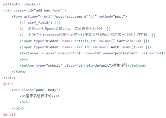 5、我们还可以在一个页面调用一些方法,比方说框架自带的用户系统,我们可以在模板中直接使用方法 auth::check()