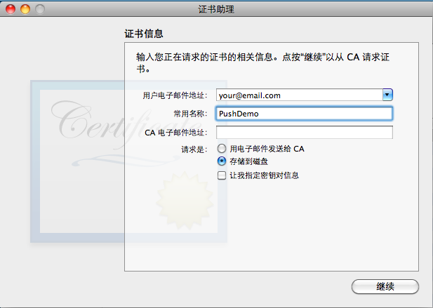 [macbook-应用程序-实用工具-钥匙串访问-证书助手-从证书机构求证书-证书信息(用户电子邮箱地址{填写您的邮箱,如:your@email.com},常用名称{任意,如:pushdemo},请求是:{单选,选择‘存储到磁盘'})-继续-保存],这时会在您指定的地方生成你指定的文件,默认为certificatesigningrequest.certsigningrequest文件,这里命名为:pushdemo.certsigningrequest.在此*.certsigningrequest已经生成,具体操作步骤如图所示。