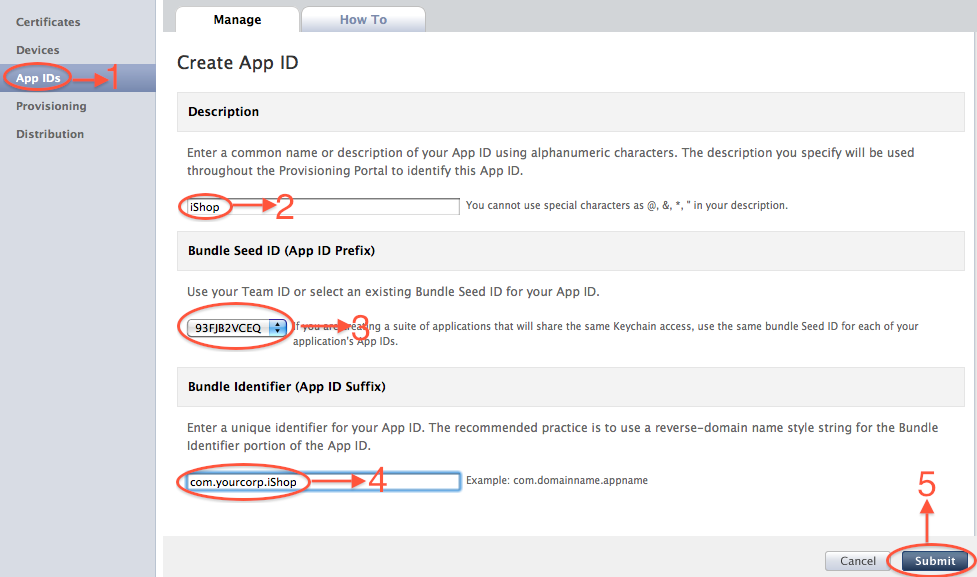 (2)创建new app id[app idsàmanageànew app id]( description{填写您对此app id的描述,如:ishop},bundle seed id(app id prefix){选择绑定app id前缀,如:默认选择generate new},bundle identifier(app id suffix){填写绑定app id后缀,如:com.yourcorp.ishop}),如下图所示: