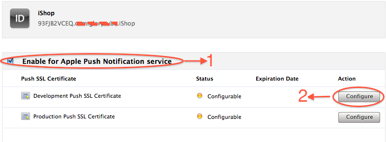 (3)配置上一步中生成的app id,让其支持消息推送[点击2-6中的configureà选中enable for apple push notification serviceà点击configure],如图所示:
