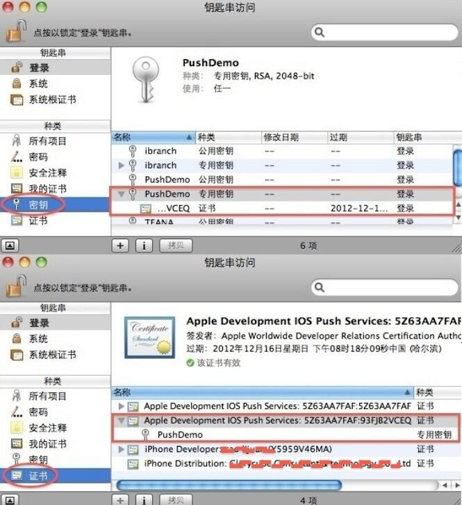 如果生成成功,则会在[钥匙串访问|登录|密钥]栏目中列出与*.certsigningrequest关联的密钥,这里是pushdemo,如图所示: