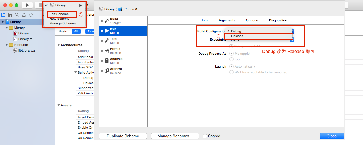 ①在工程编译(command+b)之前"标号为②的框框中liblibrary.a"为红色(编译之后为黑色, 红色表示一个虚拟的文件工程中找不到它),如图3所示: